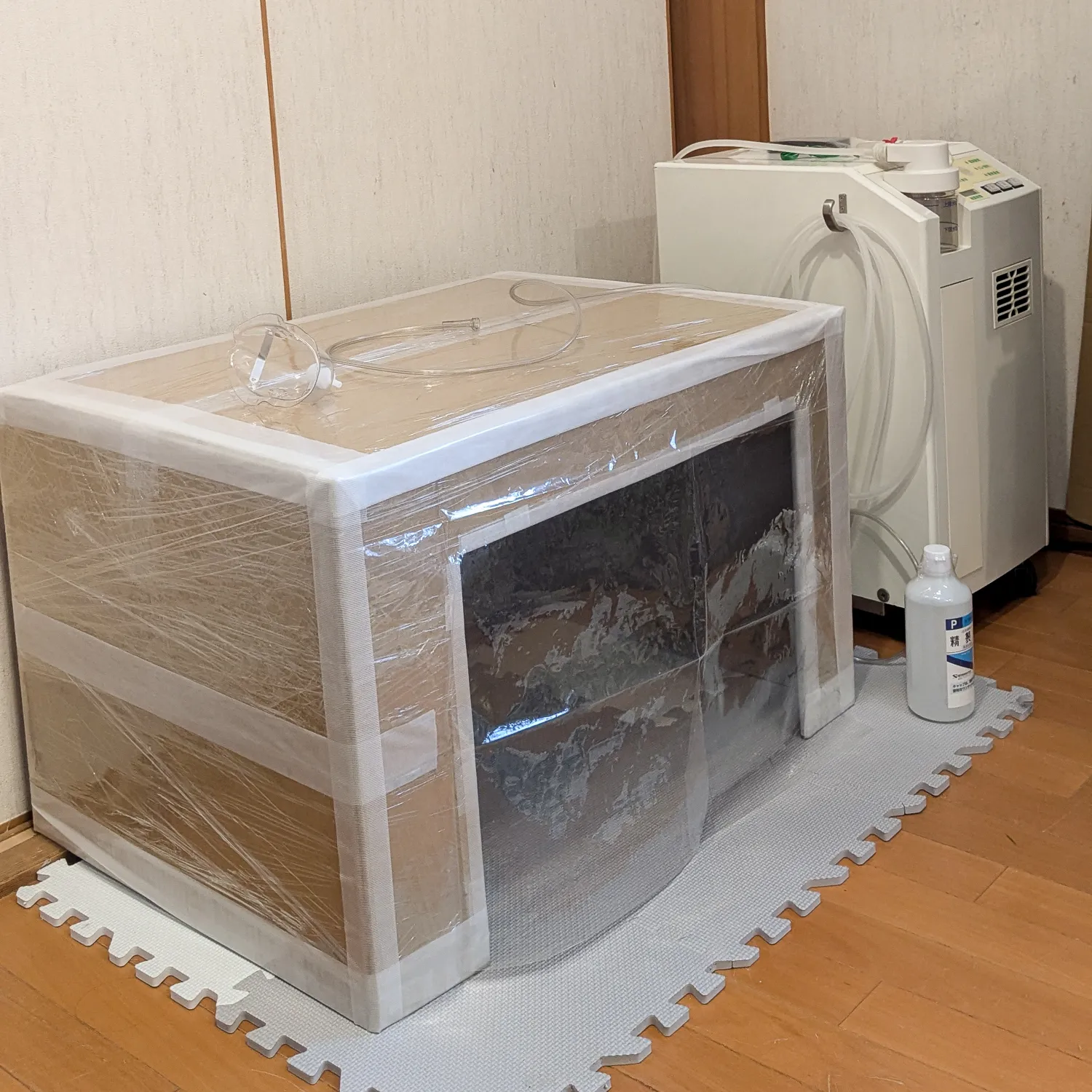 段ボール(段ボール以外でも大丈夫)とサランラップ・テーブルクロスで酸素のお部屋を作れます。